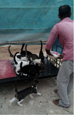 ^ Volunteer feeding the cats who rely on the goodwill of the construction workers for food